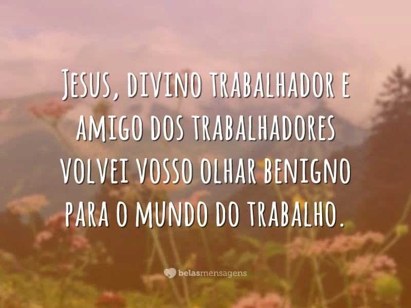 Jesus, divino trabalhador e amigo dos trabalhadores volvei vosso olhar benigno para o mundo do trabalho. Nós vos apresentamos as necessidades dos que trabalham intelectual, moral ou materialmente. Bem sabeis como são duros os nossos dias, cheios de canseira, sofrimento e insídia. Vede as nossas penas físicas, morais e repeti aquele brado de vosso coração:…