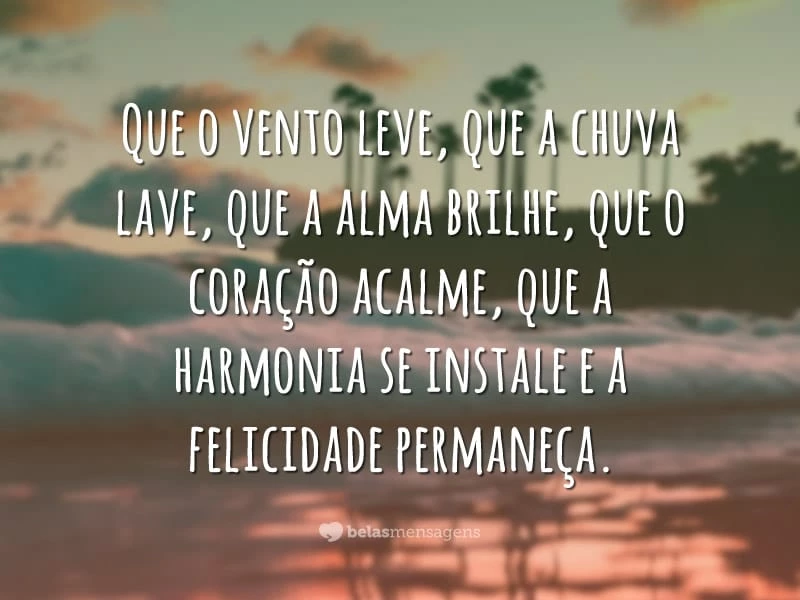 Que o vento leve, que a chuva lave, que a alma brilhe, que o coração acalme, que a harmonia se instale e a felicidade permaneça.
