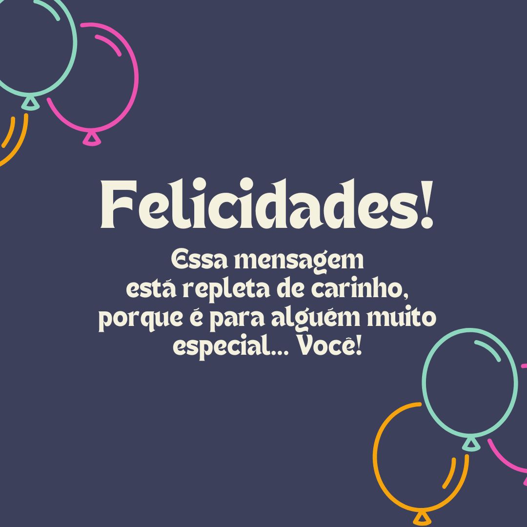Felicidades! Essa mensagem está repleta de carinho, porque é para alguém muito especial… Você! Feliz aniversário, desejo grandes alegrias e boas surpresas.