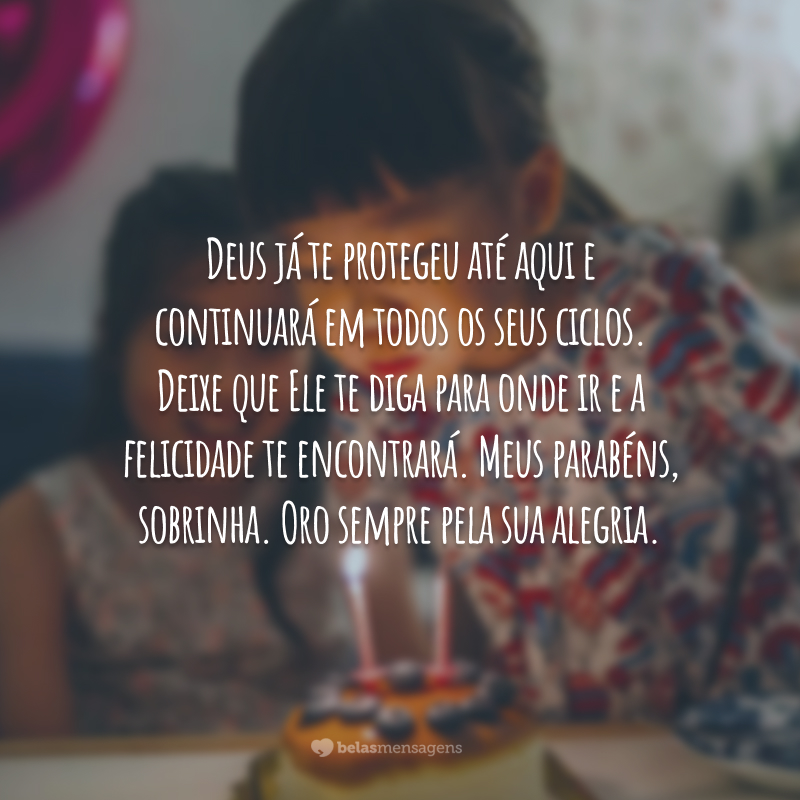 O nosso Deus já nos abençoou quando você nasceu e renova essa alegria a cada aniversário. Que Ele possa guiar seus passos e te trazer grandes alegrias. Parabéns, sobrinha maravilhosa.