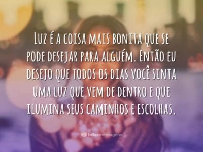 Luz é a coisa mais bonita que se pode desejar para alguém. Então eu desejo que todos os dias você sinta uma luz que vem de dentro e que ilumina seus caminhos e escolhas.