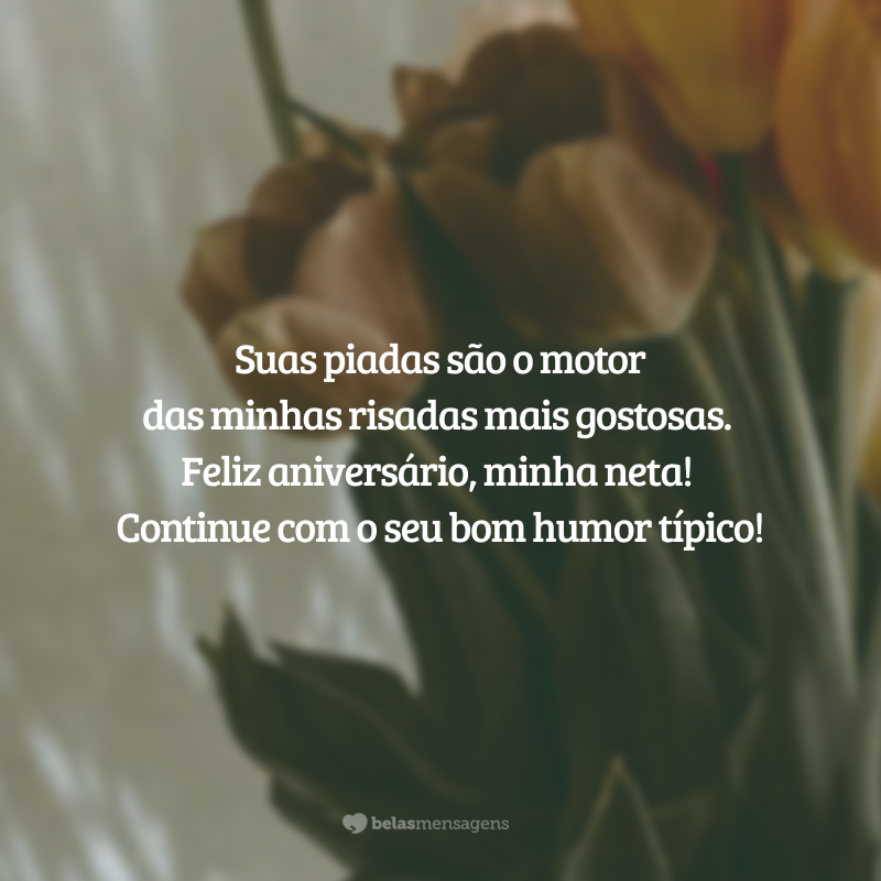 Suas piadas são o motor das minhas risadas mais gostosas. Feliz aniversário, minha neta! Continue com o seu bom humor típico!