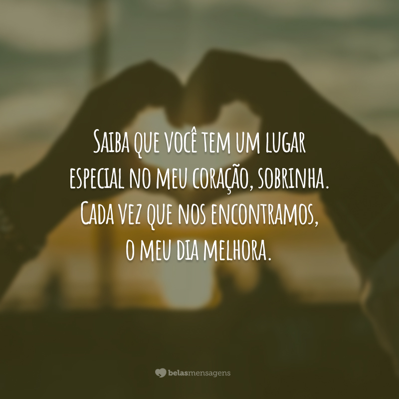 Saiba que você tem um lugar especial no meu coração, sobrinha. Cada vez que nos encontramos, o meu dia melhora.