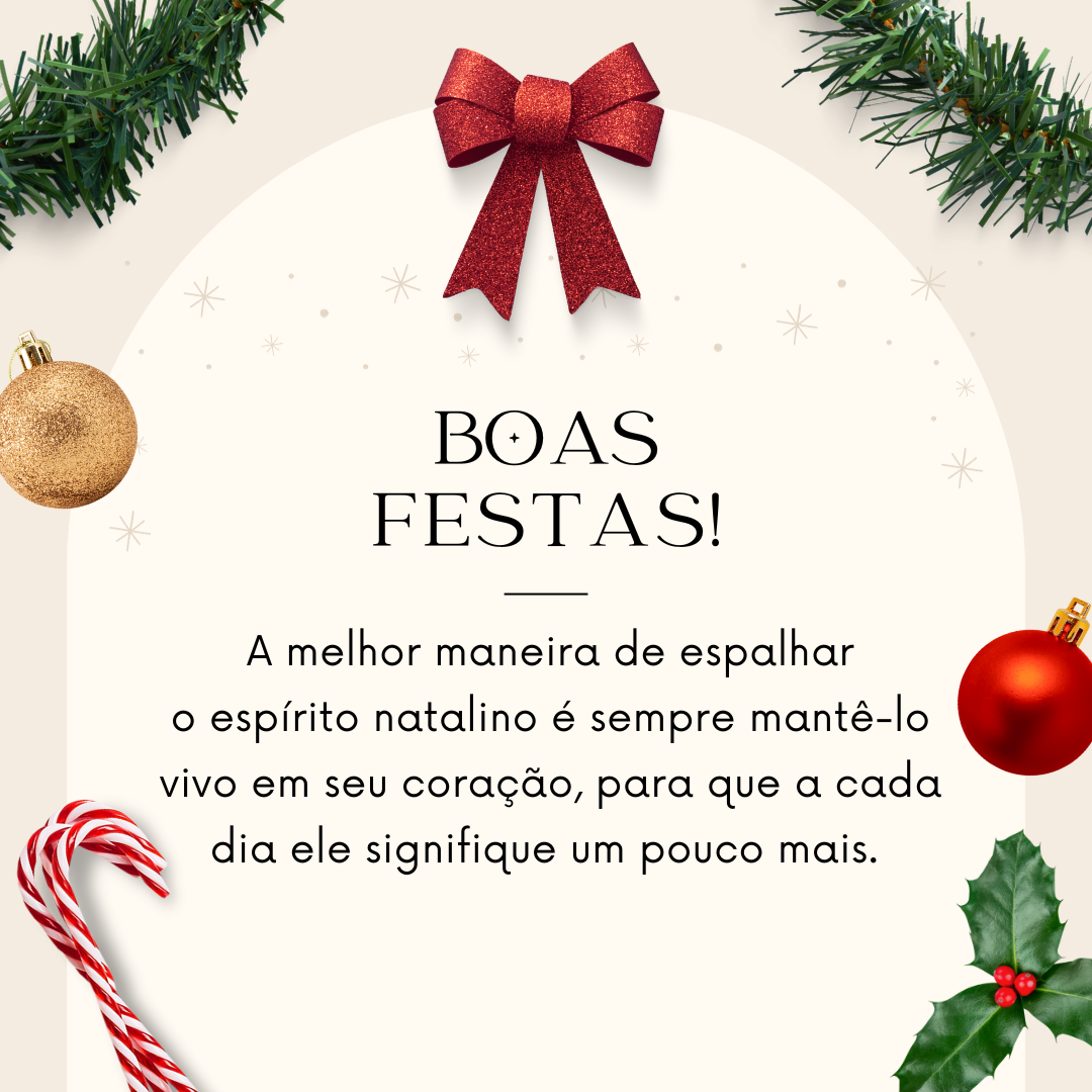 A melhor maneira de espalhar o espírito natalino é sempre mantê-lo vivo em seu coração, para que a cada dia ele signifique um pouco mais. Boas Festas!