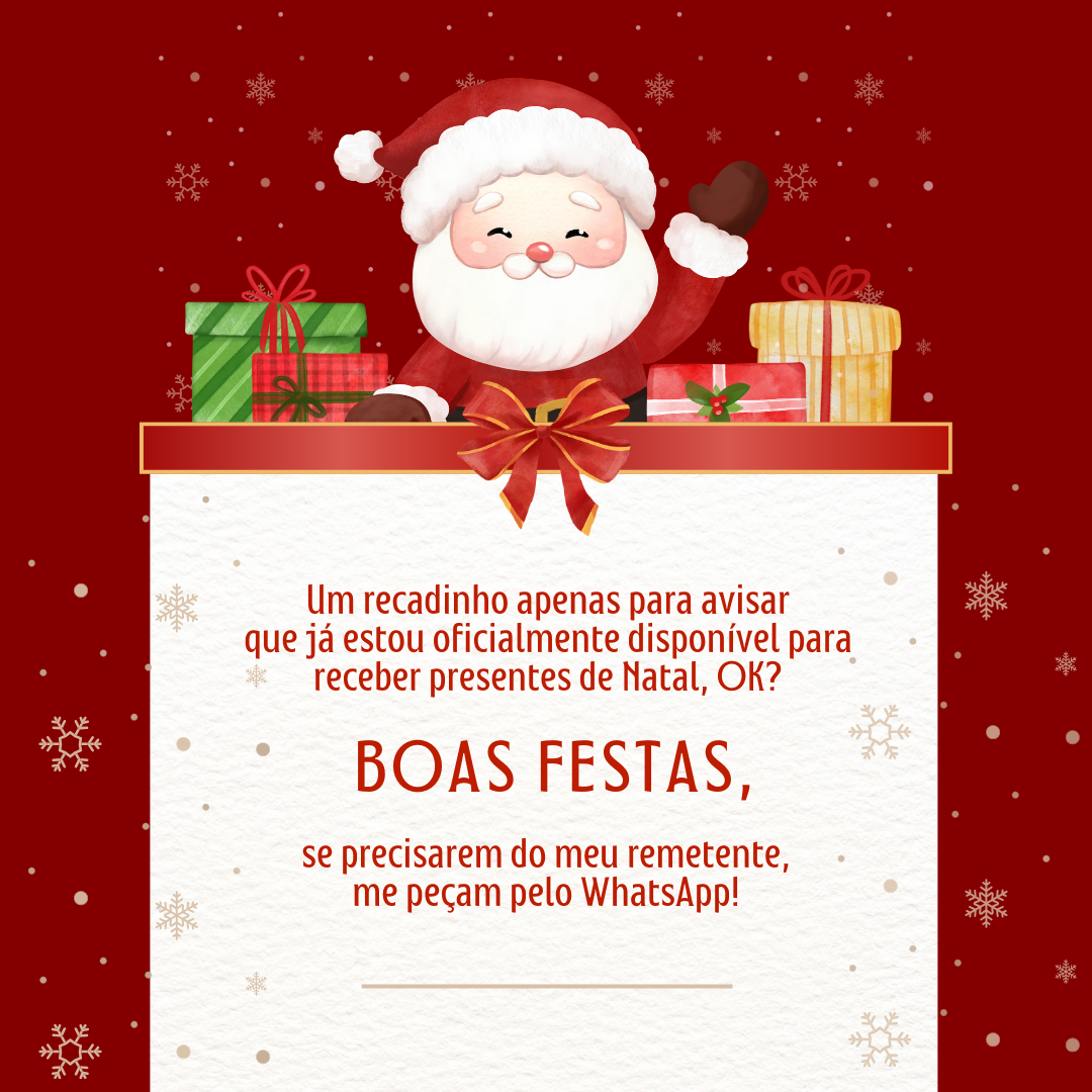 Um recadinho apenas para avisar que já estou oficialmente disponível para receber presentes de Natal, OK? Boas Festas, se precisarem do meu remetente, me peçam pelo WhatsApp!