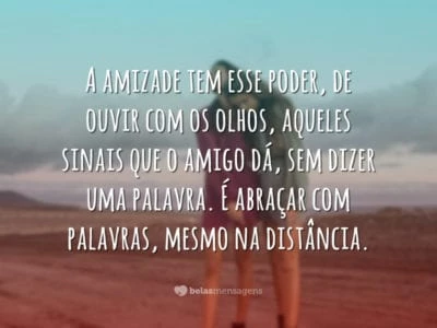 A amizade tem esse poder, de ouvir com os olhos, aqueles sinais que o amigo dá, sem dizer uma palavra. É abraçar com palavras, mesmo na distância. É morrer de rir sem motivo algum, é alegrar-se com a alegria alheia e morrer de preocupação quando o outro está triste. É ser abrigo, ser mais que casa, um lar para o outro correr sempre que precisar. E receber tudo isso de volta. Mas sobretudo, é doar, sem interesses, apenas esperando pela felicidade alheia.