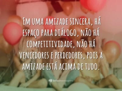Quando há sinceridade, a amizade dura mais. Não precisamos fazer de conta, não precisamos fingir que está tudo bem quando não está, não precisamos guardar rancor. Em uma amizade sincera, há espaço para diálogo, não há competitividade, não há vencedores e perdedores, pois a amizade está acima de tudo. Para uma amizade durar é preciso…