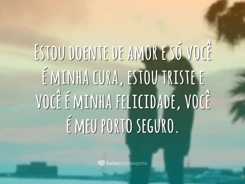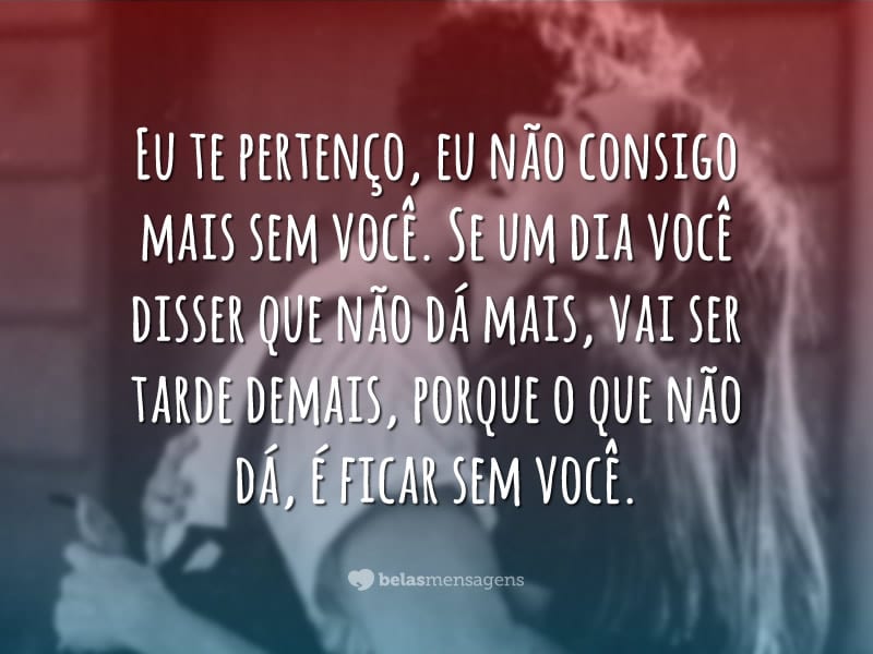 Te amo de uma forma que eu não consigo explicar, nem tão pouco por em palavras. É tão grande, tão lindo, tão sei lá. Fico imaginando como eu consigo amar tanto alguém como eu te amo, como esse sentimento todo cabe em mim, uma pessoa tão pequena. Eu te pertenço, eu não consigo mais sem você. Se um dia você disser que não dá mais, vai ser tarde demais, porque o que não dá, é ficar sem você.