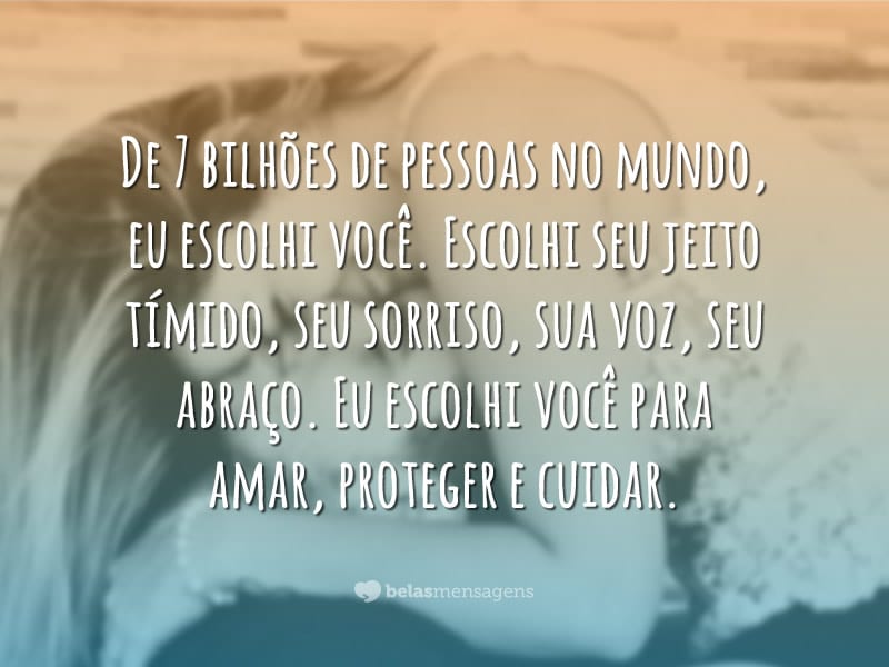 De 7 bilhões de pessoas no mundo, eu escolhi você. Escolhi seu jeito tímido, seu sorriso, sua voz, seu abraço. Eu escolhi você para amar, proteger e cuidar. É incrível como você me fez mudar, não consigo olhar para mais ninguém com os olhos que eu tinha antes de você aparecer. Mas isto será amor?…